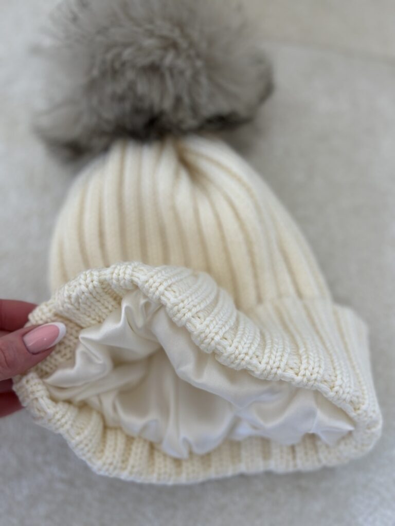Mütze mit Seidenfutter und Pompon 100% Merinowolle Ecru + 2 Gratis Haargummis